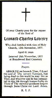 1. Leonard Charles LOVESEY. Born on May 22 1916 in Stirchley, Birmingham, England. Leonard died on Nov 12 1977 in 44 Frances Rd, Cotteridge, Birmingham; he was 61.