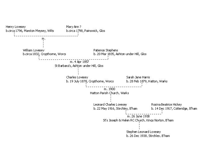 o 1901 Census – William Lovesey (retired Ag Lab), & Patience were living at The Den in Cropthorne, Worcs