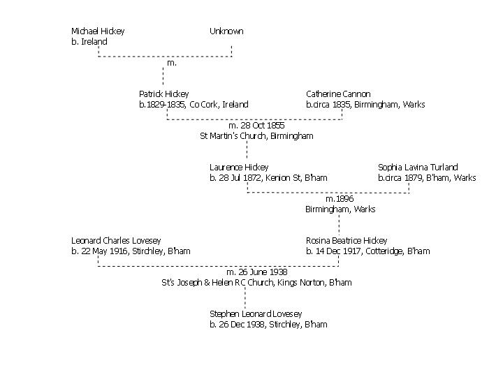 o 1911 – Census - Laurence Hickey (General Labourer, Metal Works), Sophia (married 14yrs) and their 7 children are living at 52 Francis (sic) Road, Kings Norton nr Birmingham